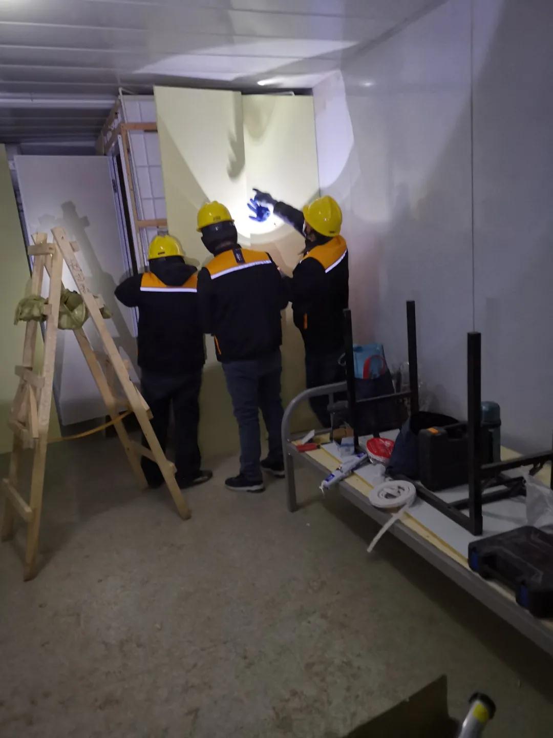 接到指令,馬上參建。19日晚,常宏第一批六名工人進(jìn)入隔離區(qū)施工現(xiàn)場(chǎng),并迅速連夜投入工作,為隔離間的衛(wèi)生間外側(cè)安裝墻板,直至凌晨。短暫休整后,于20日一早再次投入施工中,仍有更多常宏工人將在辦理完成社區(qū)/村/鎮(zhèn)的出入手續(xù)后陸續(xù)加入到現(xiàn)場(chǎng)。